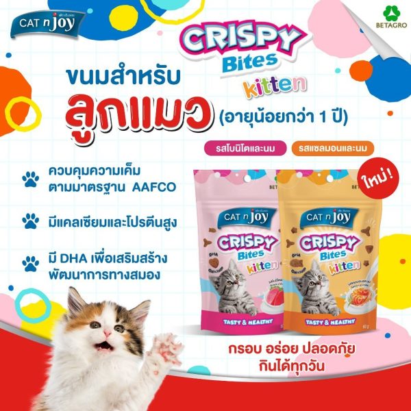 CAT n joy Crispy Bites (60g) ขนมแมวกรุบกรอบ แคทเอ็นจอย บำรุงขน มีสูตรลูกแมว รสทูน่า แซลมอน ซีฟู้ด