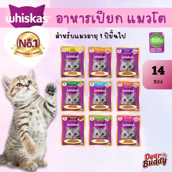 Whiskas วิสกัส อาหารเปียกสำหรับแมวโต (1 ปี+) ขนาด 80g x14 ซอง มีหลายรสชาติ เนื้อปลาแท้