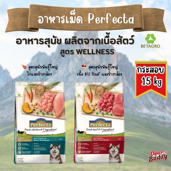 Perfecta อาหารสุนัข เกรดพรีเมียม กระสอบ สูตรสุนัขพันธุ์ใหญ่ รสไก่ รสเนื้อ ผสมข้าวกล้อง ไม่เค็ม โดย Betagro