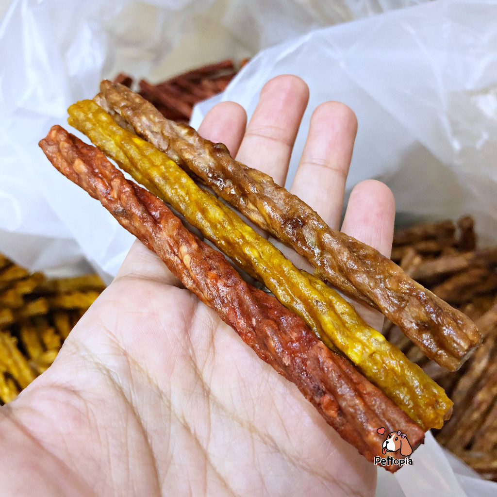 หนังสัตว์ (โค/กระบือ), แป้งข้าวเหนียว, มอลโตเด๊กตริน, น้ำมันปาล์ม, สารปรุงแต่งกิ่น, สารถนอมคคุณภาพอาหารสัตว์, สารปรุงแต่งสี