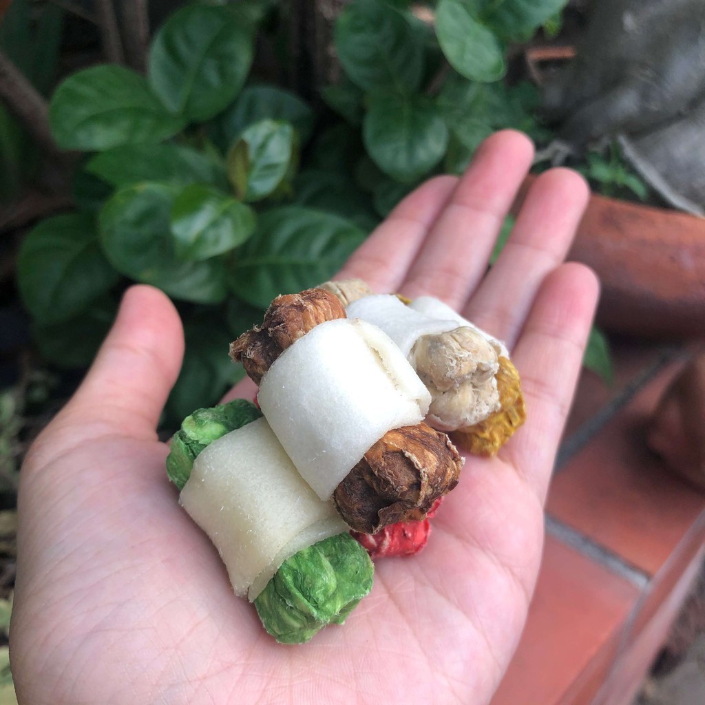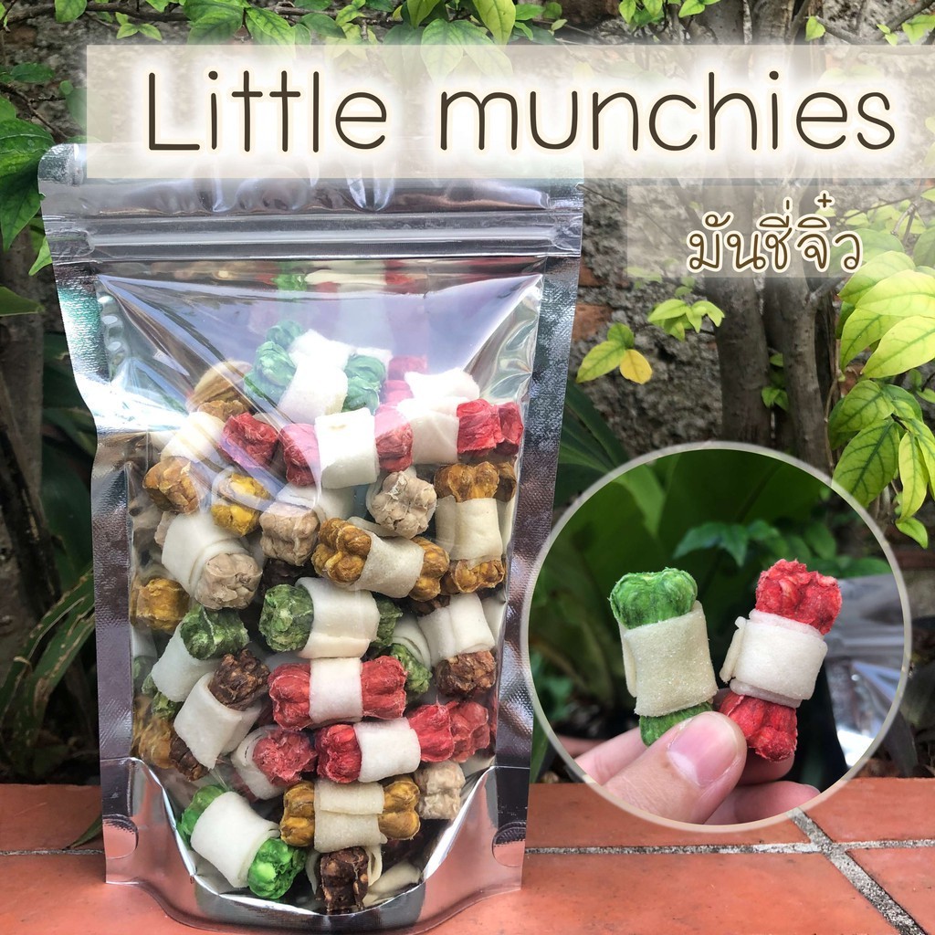 มันชี่จิ๋ว มันชี่ทำมาจากหนังวัวบดอัดเป็นรูปกระดูกสุดน่ารัก พันด้วยหนังวัวสีขาวที่มีกลิ่นหอมๆที่น้องหมาชื่นชอบ