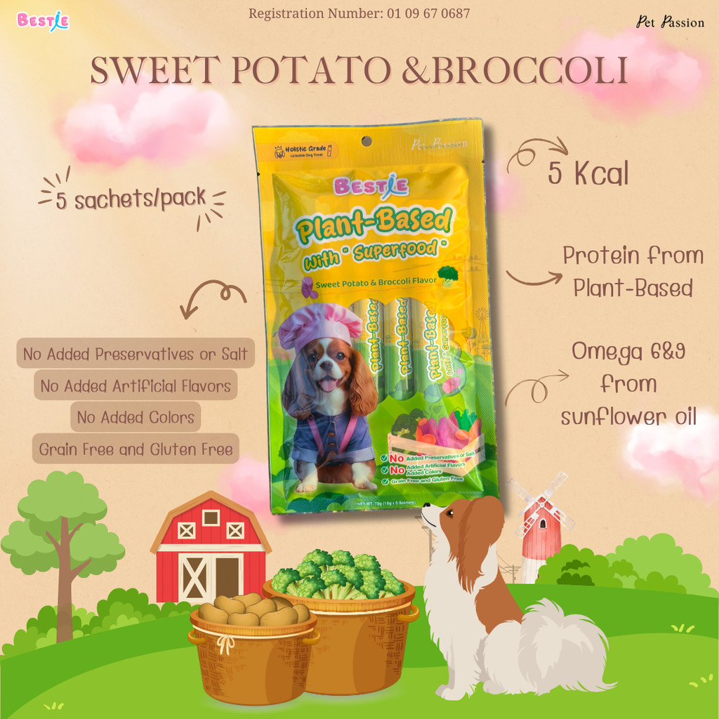 ขนมหมาเลีย BESTIE Plant-Based รสSweet Potato & Broccoli เต็มไปด้วยโปรตีนคุณภาพ ปราศจากเนื้อสัตว์