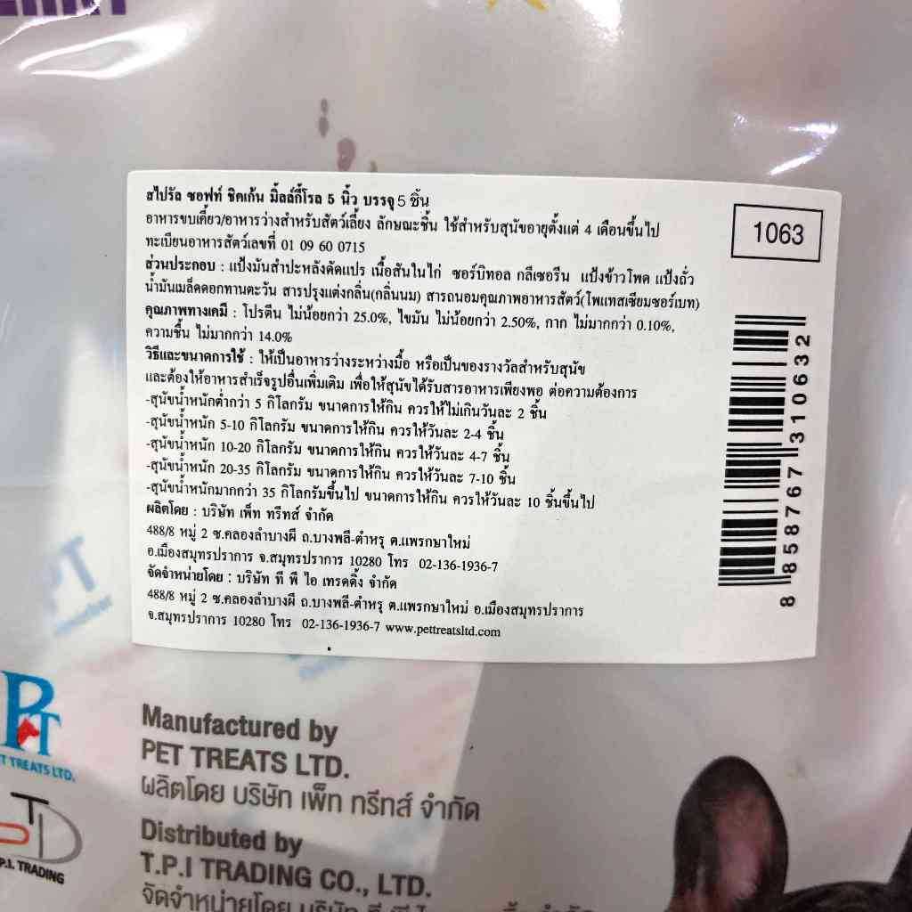 ส่วนประกอบ : แป้งมันสำปะหลังดัดแปร เนื้อสันในไก่ ซอร์บิทอล กลีเซอรีน แป้งข้าวโพด แป้งถั่ว น้ำมันเมล็ดดอกทานตะวัน สารปรุงแต่งกลิ่น (กลิ่นนม) สารถนอมคุณภาพอาหารสัตว์ (โพแทสเซียมซอร์เบท)