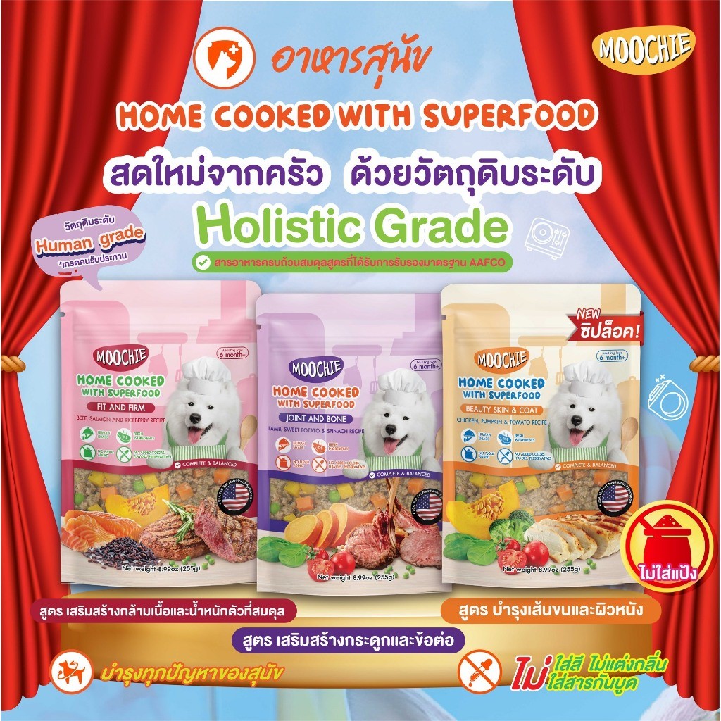 Home cooked อาหารสุนัขปรุงสุกพร้อมทาน “บำรุงเส้นขนและผิวหนัง” อาหารสุนัขเกรด Holistic วัตถุดิบ Human Grade (เกรดเดียวกับคนรับประทาน) ใช้เนื้อสัตว์แท้ นำเข้าจากต่างประเทศ มีส่วนผสมของSuperfood ปริมาณ 1 ซอง 255 g. สุนัขไซส์กลางจนถึงไซส์ใหญ่ ทานได้ 1 มื้อ สุนัขไซส์เล็ก ทานได้ 1 วัน “สะดวก ทานง่าย เพียง ฉีก เท ทาน” สามารถทานได้เลย ไม่ต้องปรุงสุกอีกครั้ง