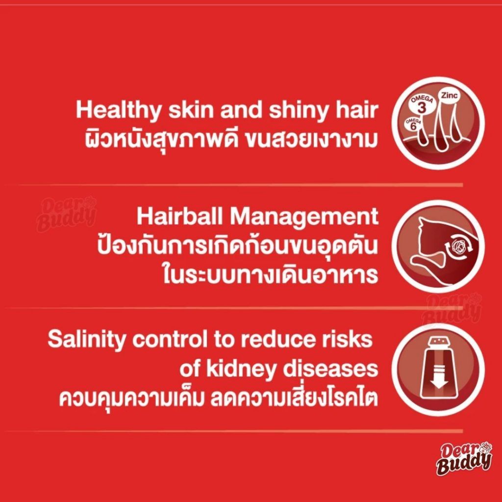 – ขนสวยเงางามสุขภาพดี: บำรุงผิวหนังและเส้นขนให้แข็งแรง ลดการจับตัวของก้อนขน ช่วยให้ระบบทางเดินอาหารทำงานได้ดี